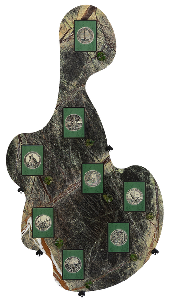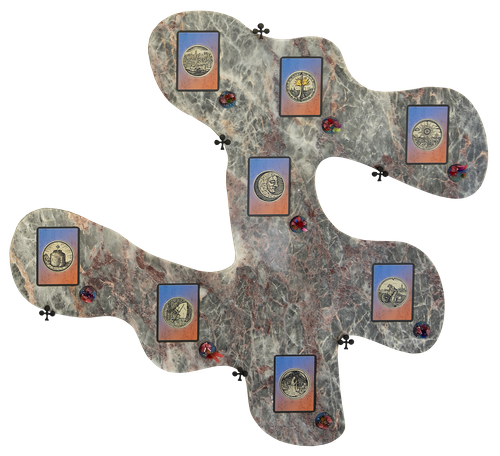 2023, polished marble and onyx, resin bases, forged iron, 64 black core board paper cards from “Horizontal Twilight Spells – Set 2: Xi”, force-directed graph, 240 x 240 cm